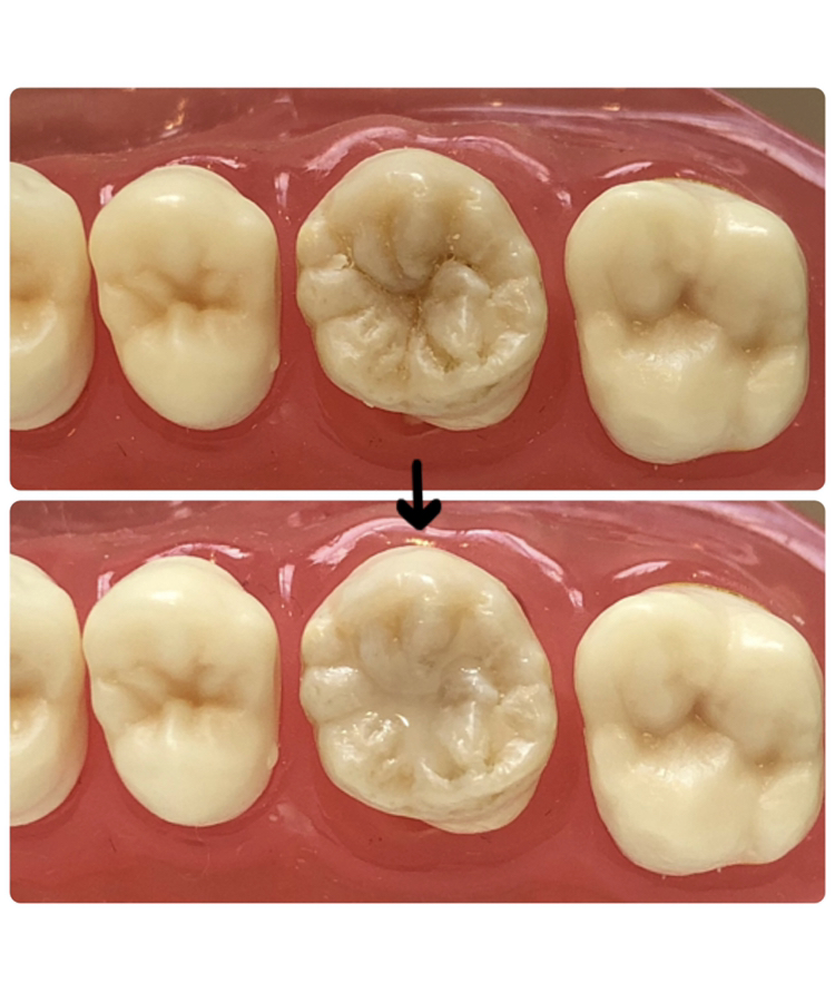 奥歯のかむ面の溝にレジンと呼ばれるプラスチックの樹脂を埋め込み、